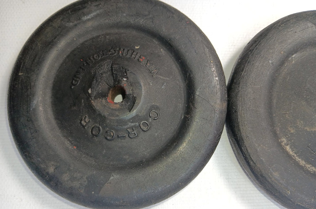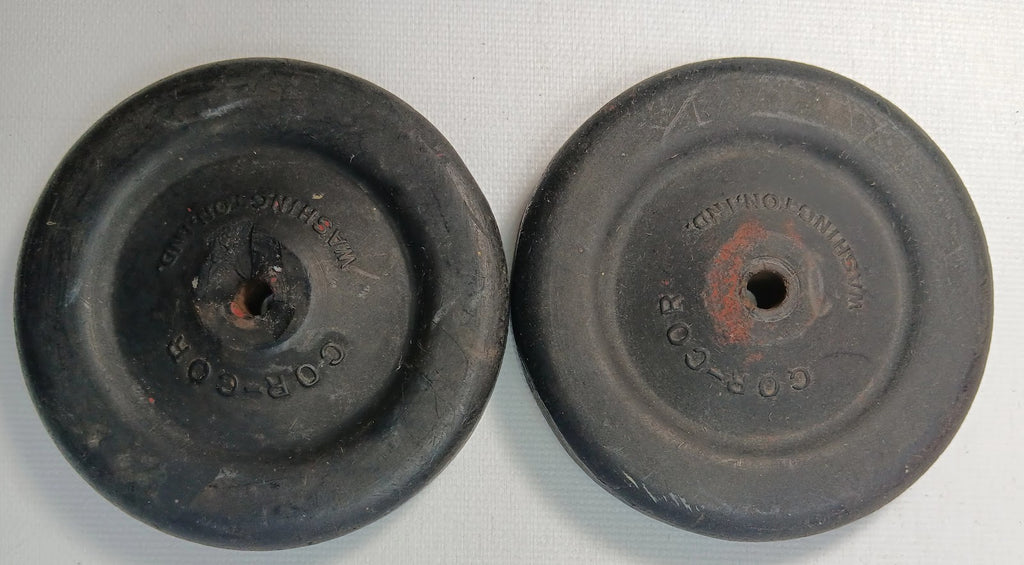 Cor-Cor original hard bakelite 3" wheels. Set of two only. Some damage around the axle hole of one of the tire. Please check out picture before ordering. These are sold as is. Original