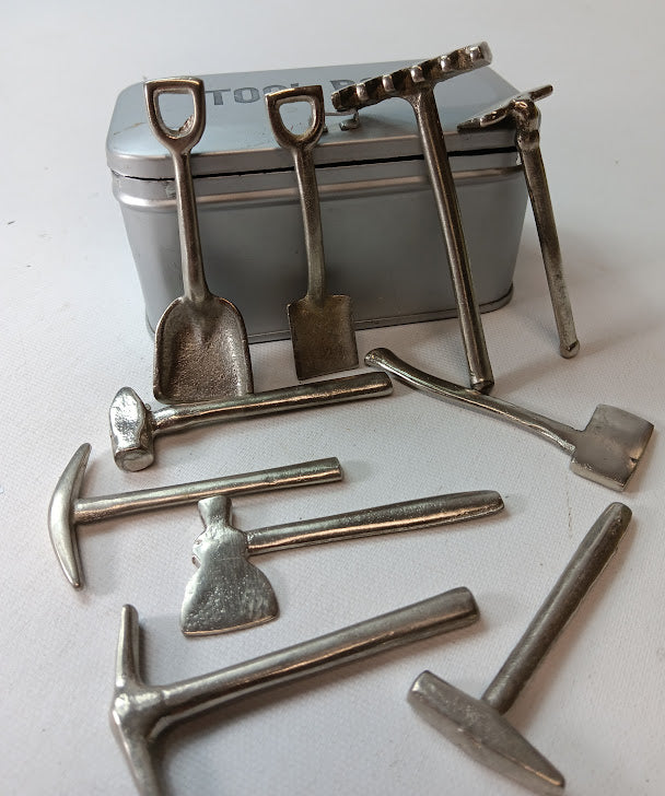 Lionel Mike's Train House Toy Mini Tool Box with 9 Tools. 5" x 2-1/2' Metal Tin and Cast tools.  Reproduction Lionel Standard Gauge.