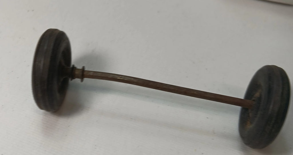 3-1/2" toy car axle with wheels and hubs Original condition. Axle bent