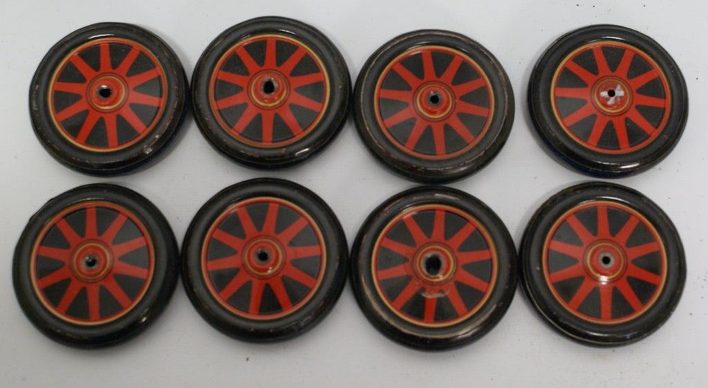 Tinplate Lithographed wheels. 2-5/8" Diameter x 1/2" Wide. Set of 8.