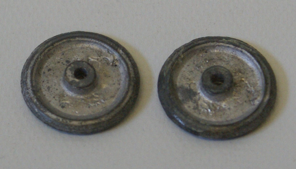 Toy Diecast wheels (two) 3/4" Diameter. Outside looks more like a ballon tire. Not sure if these are Britains or another maker. Cast metal unpainted. Two wheels.