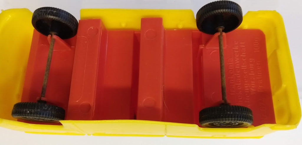 Plastic toy bus good for parts or wheels.  Wheels are molded plastic  1" diameter with 2-1/4" axles